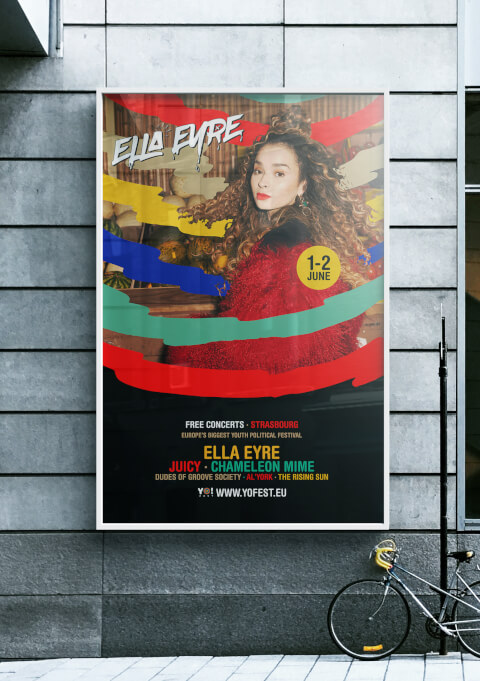 Yo ! Fest rassemble 10 000 jeunes autour de la musique et d'activités politiques, pour discuter et élaborer l'avenir de l'Europe. Pour son édition 2018, la demande a été de créer une communication global et adaptative multisupport qui les connecte a un public européen de 16 à 30 ans.